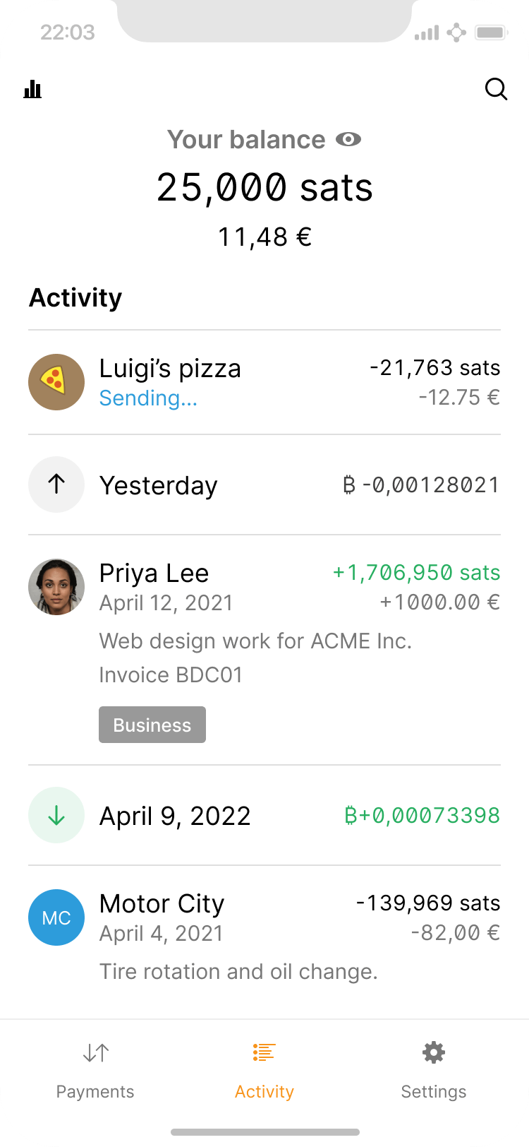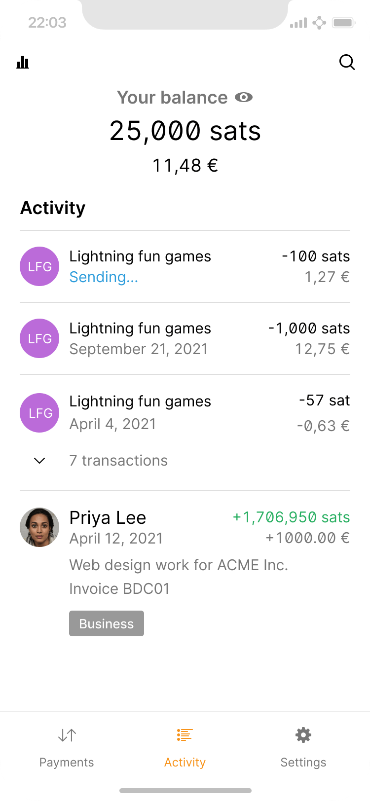 The lightning network makes micropayments economically and technically viable. For example, as a user listens to a podcast, they may stream 10 sats per minute to the host as a thank you. This can easily result in a cluttered activity list, which can be remedied via automatic grouping.