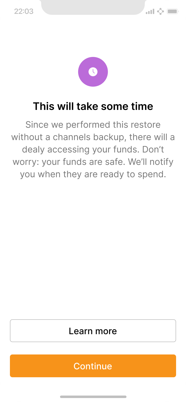 A more complicated and unlikely scenario is one in which the channel’s backup has gotten corrupted in the user’s cloud account or deleted somehow. In this situation, the LSP can force close the channels for the user. This would send the user’s funds to an on-chain address. Once those funds are confirmed on-chain, the wallet will then automatically use those funds to open fresh channels with the LSP for the user. However, this will take some time, so the wallet is very clear in letting the user know that this will take longer.