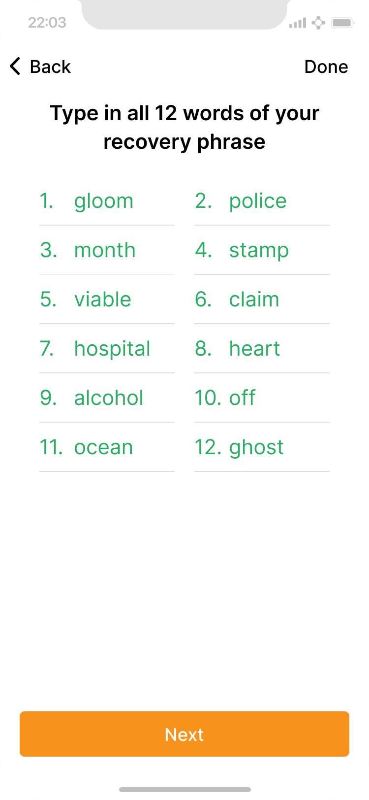 User enters their recovery phrase. The app can autocomplete words for the user.
