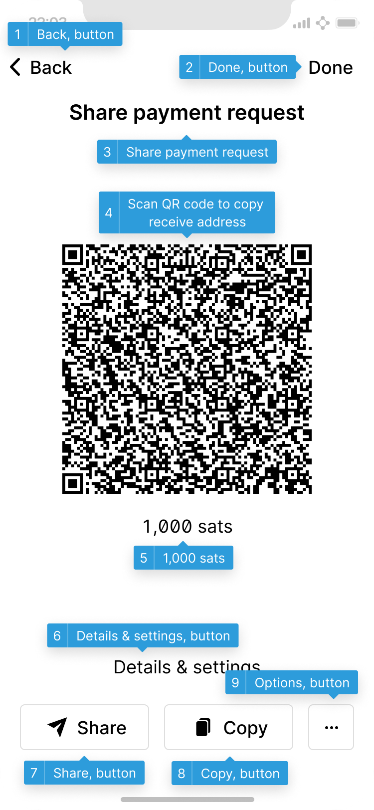 It is impossible to know what a button does when it is only labelled as “button”, and not with its function. Testing has shown that QR codes are often not selectable at all, which makes them invisible to users reliant on screen readers. A good solution is a label such as “QR code to copy the receive address”.