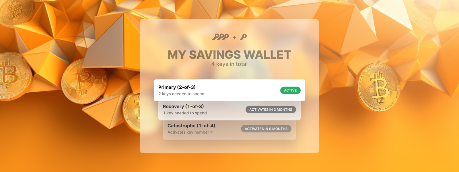 Condition 3 (emergency): After 12 months of wallet inactivity, unlock a third spending condition which activates a fourth key that is not part of the first two conditions.
